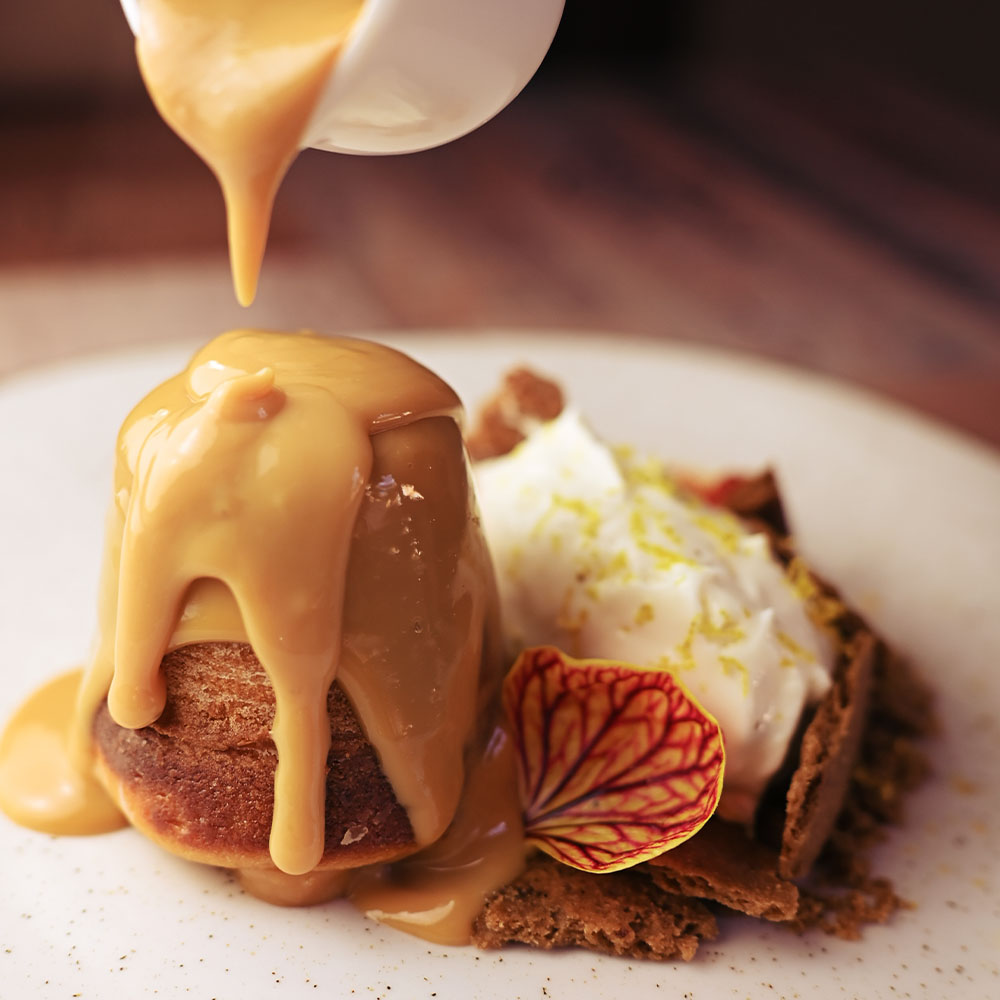 Petit gâteau de doce de leite com recheio cremoso de Canastra, servido com pairfait gelado de creme cheese com siciliano e finalizado com crumble crocante de café. Resumo de Minas numa só colherada: doce de leite, queijo e café.